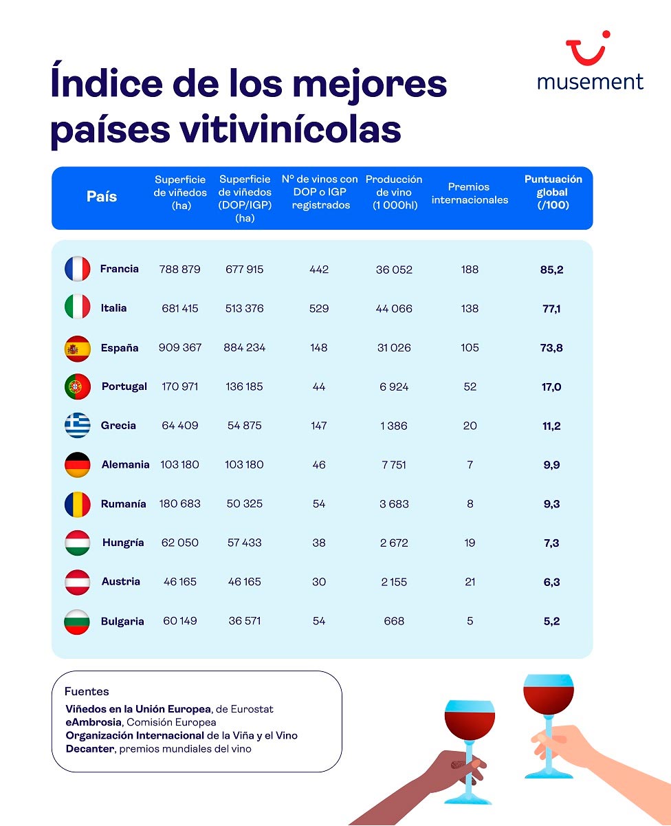 El análisis de TUI Musement ha evaluado diversos factores clave para determinar los mejores destinos de enoturismo: superficie de viñedos, extensión dedicada a vinos con Denominación de Origen Protegida (DOP) e Indicación Geográfica Protegida (IGP), número de vinos registrados con estas distinciones, volumen de producción y premios internacionales obtenidos.